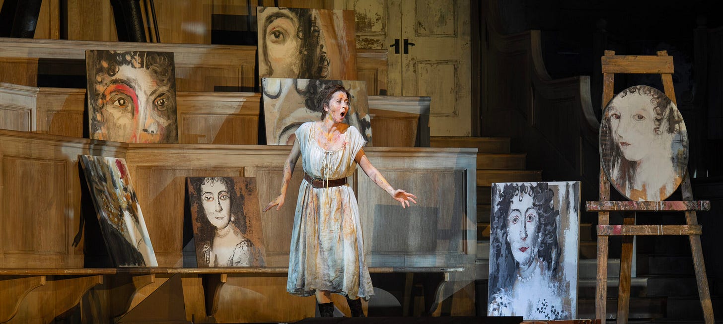 All the production’s choices were confusing to me. Riccardo is a drunk, which is plausible enough, I guess, even (especially?) among Puritan soldiers; but it also makes Elvira a painter, which is just bizarre. At a point of particular madness she holds up what seems to be a self-portrait done in an expressionist style. In the 1640s! What are we doing!